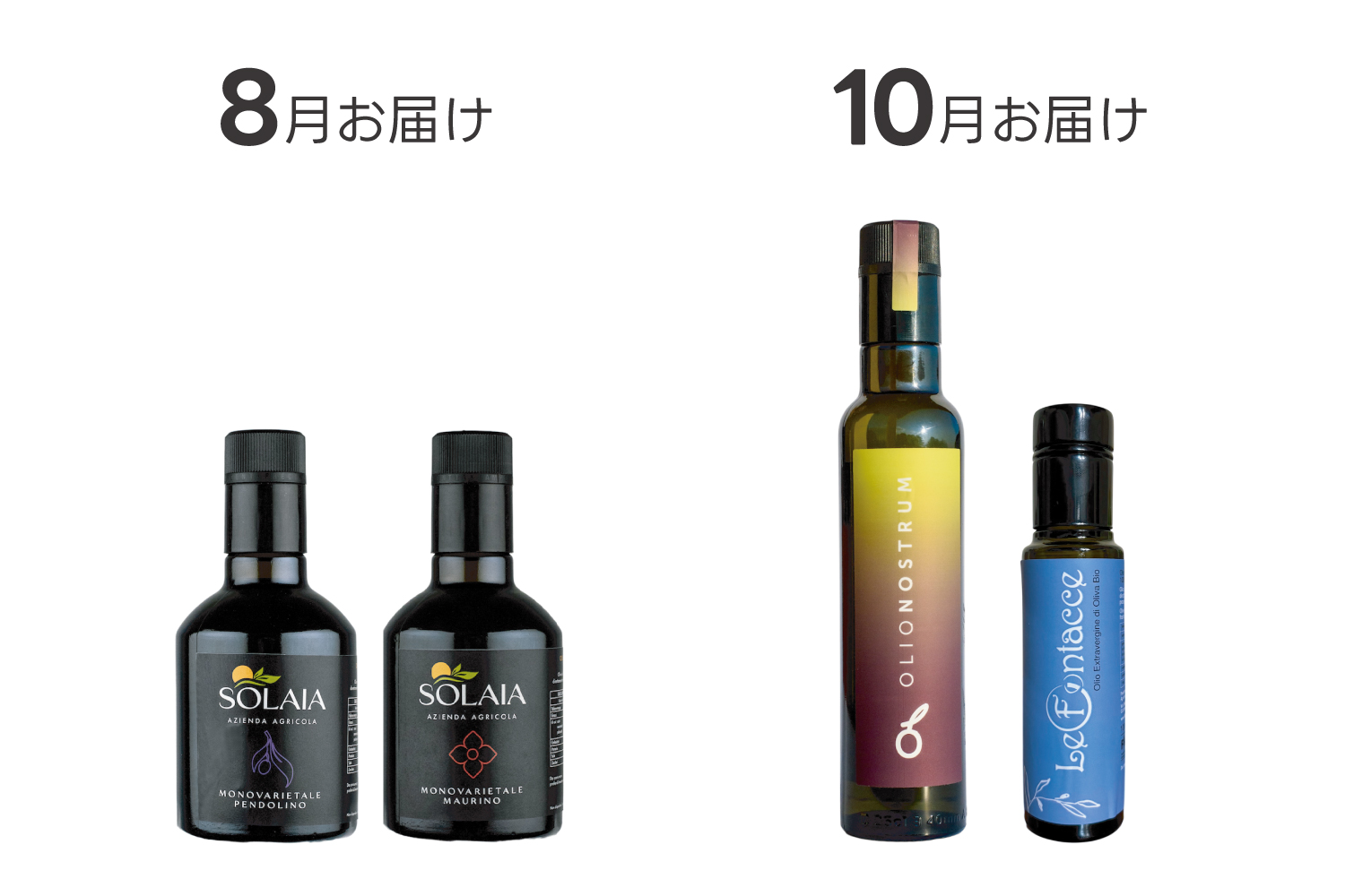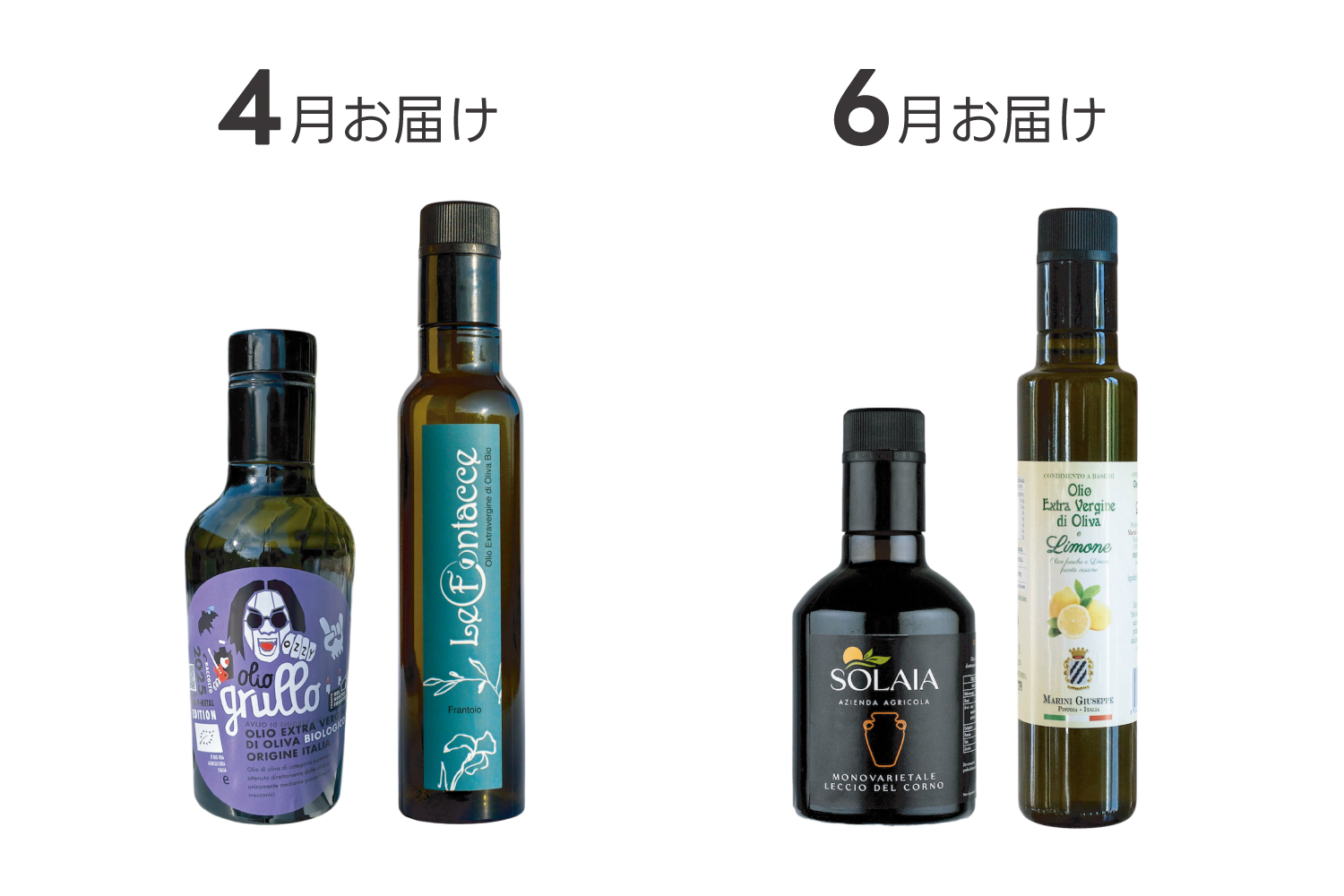 今年収穫されたばかりの新鮮オイルが年6回楽しめます。 毎回違うトスカーナ州小規模生産者のエキストラバージン・オリーブオイル(2〜3本)とレシピ付き商品ガイドが2ヶ月に一回届く便利なコースです。